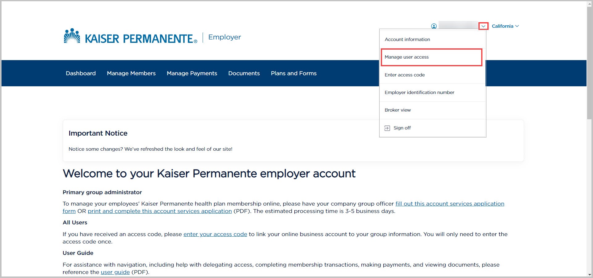 The selected Primary Group Administrator must register for an account if you don’t already have an existing account.kp.org user ID. Once the access code email is received, log into account.kp.org and enter the code within seven days, using the 'Enter access code' option in account dropdown menu. This will confirm your role as the Primary Group Administrator.